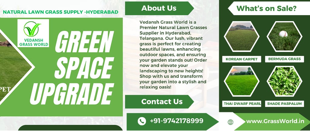 Vedansh Grass World is a leading natural lawn grass supplier in Hyderabad, Secunderabad, Bangalore, Chennai, Visakhapatnam, Warangal, Vijayawada, Kurnool, Tirupati, Nizamabad, Khammam, Guntur and more. We offer fresh, soft, affordable, premium, organic, UV-resistant, pet-friendly, shade-tolerant, and quick-rooting grass rolls. Specializing in readymade lawn grass, turf grass, sod, and bulk grass supply for homes, villas, gardens, resorts, hotels, event lawns, builders, and parks. Fast delivery and professional turf installation available.